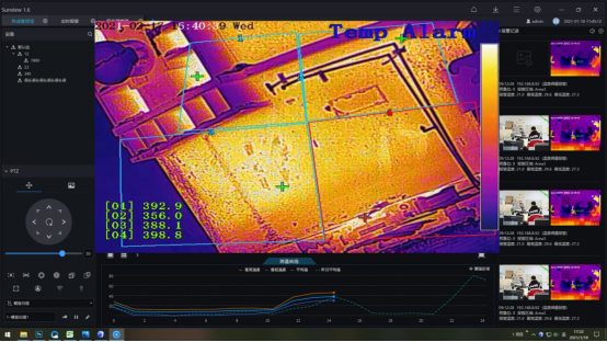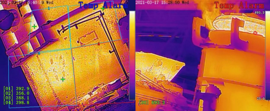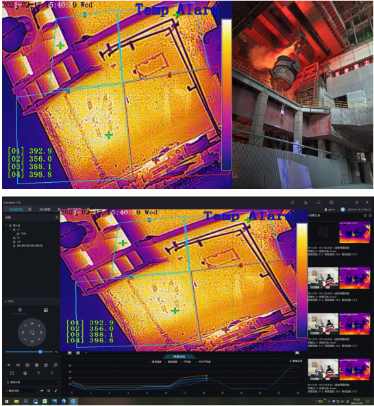 中間包外部的實(shí)時(shí)溫度被采集后,將通過光纖和網(wǎng)線瞬時(shí)反饋到主控室NVR/電腦主機(jī)上,并持續(xù)不間斷記錄運(yùn)行視頻錄像及溫度??蔀橹虚g包不同位置設(shè)置不同的預(yù)警溫度,當(dāng)中間包任何一個(gè)區(qū)域內(nèi)的實(shí)測溫度超過設(shè)定溫度,則系統(tǒng)會(huì)自動(dòng)觸發(fā)報(bào)警并抓拍報(bào)警圖片及存儲(chǔ)報(bào)警錄像,并鎖定和跟蹤最高溫的位置,相關(guān)人員則可第一時(shí)間發(fā)現(xiàn)異常和潛在的缺陷,以便安排適當(dāng)?shù)奶幚矸绞健?