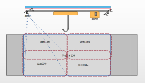 4個(gè)攝像頭分別對應(yīng)4塊區(qū)域,保證天車下方監(jiān)控?zé)o死角。
